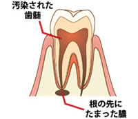 虫歯が進行し、歯髄と呼ばれる神経や血管のある部分まで感染が及び、さらに根の先に炎症が広がった状態を「根尖性歯周炎」といいます。